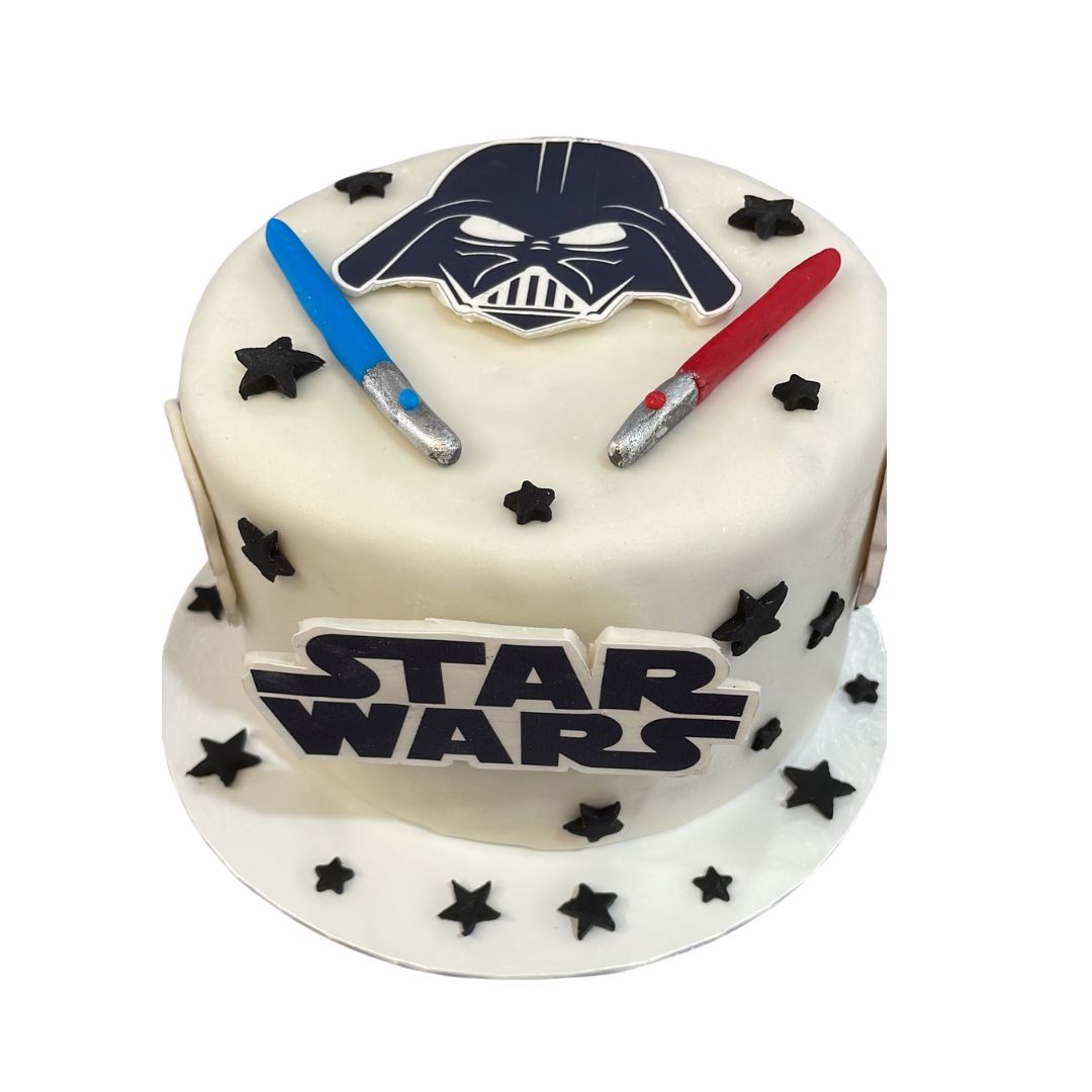 Pastel de Star Wars hecho con un pan muy esponjoso y cubierto con fondant y detalles en fondant. Personaliza el color de fondo de tu pastel.